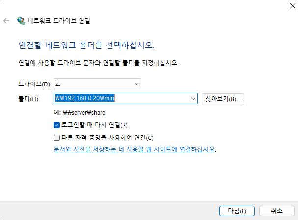 SAN 만든 후 > 내 PC 마우스 오른쪽 우클릭 > 네트워크 드라이브 연결